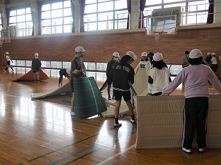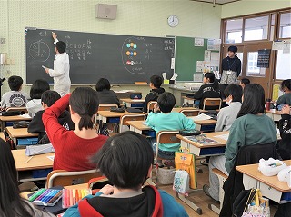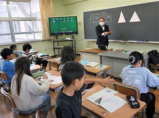 5年生の外国語科の授業です。「何が好きですか?」という問いに答えるセンテンスを学習しています。6年生の算数では、くじ引きの当たりはずれの比率から、当たりくじの本数を求めています。体育では、跳び箱に取り組んでいます。