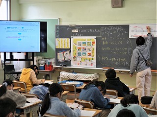 1年生の算数では、文章の問題を足し算を使って答える学習をしています。足し算ができても、どんな場面でどう使うかを理解する必要があります。2年生の国語では、漢字を組む合わせて新しい漢字を作る学習です。3年生の算数は、少人数です。3学期のまとめの問題に取り組んでいました。