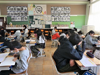 4年生の体育はマット運動です。頑張って練習しています。5年生の書写では、勢いのある書を描いています。6年生の算数は確認テストです。