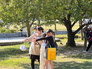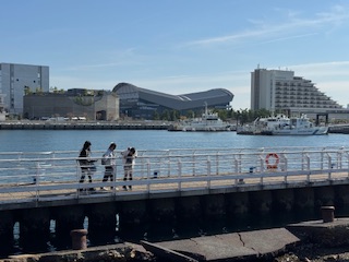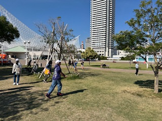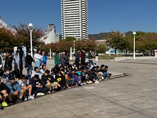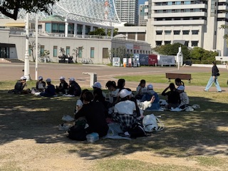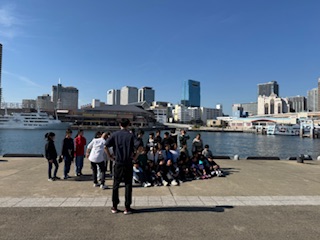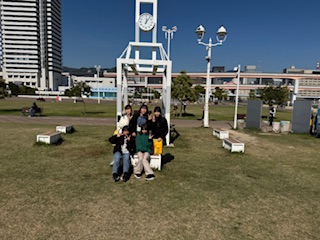 メリケンパークに到着しました。集合写真を撮りました。青空が綺麗で、さわやかな秋風が吹いています。
