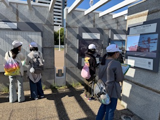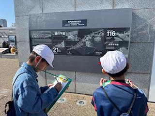 阪神淡路大震災の震災遺構を見学しました。探検バックを片手に、学習を積んでいます。