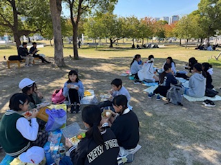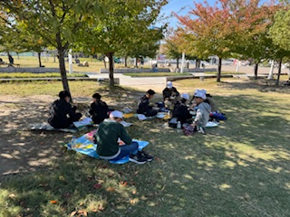 お弁当タイムです。良い天気の中で、芝生広場で食べました。元気いっぱい「いただきます」をして、食べました。朝早くから、お弁当作り、ありがとうございました。