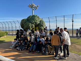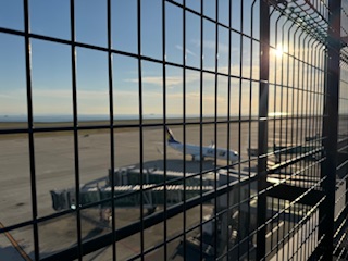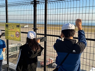 神戸空港に着きました。展望デッキで集合写真を撮りました。飛行機が発着しています。